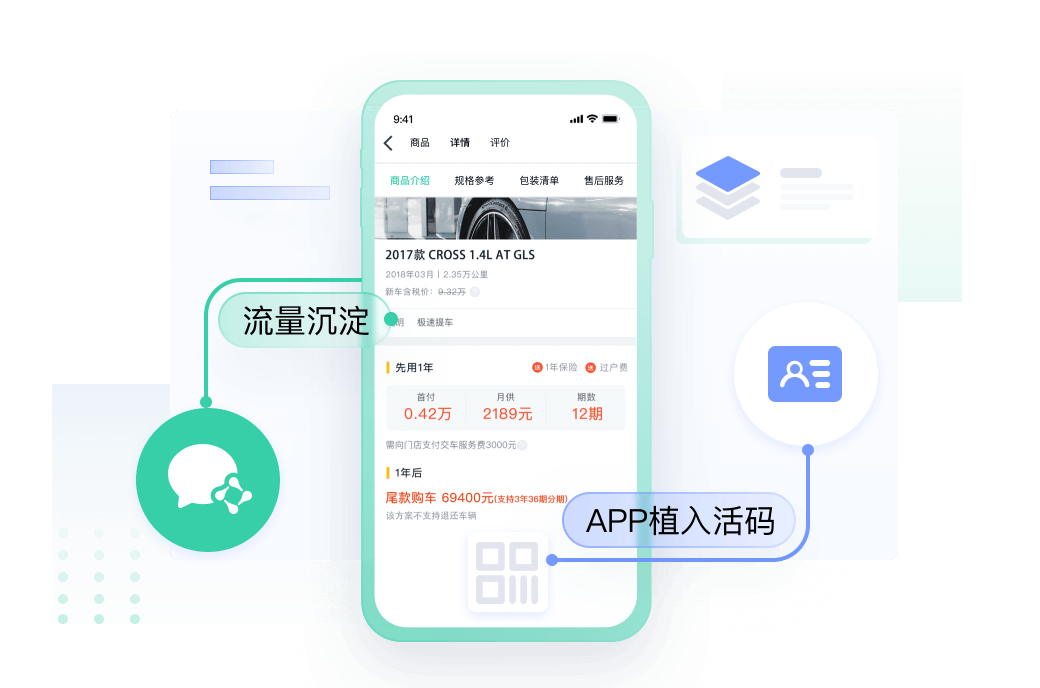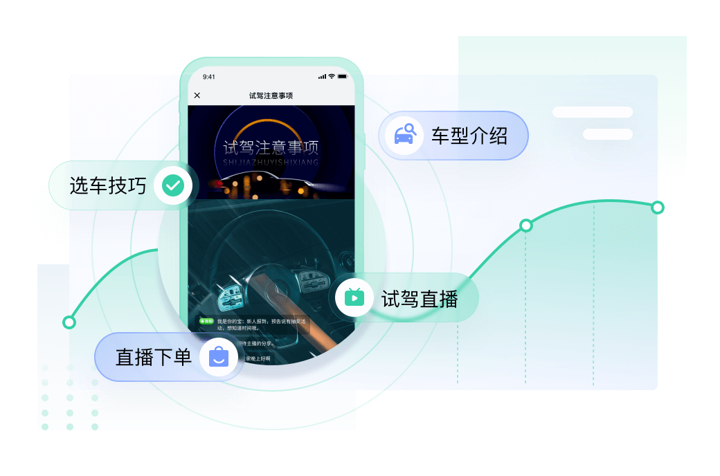 打造企业专属直播间,进行试驾直播、车型介绍直播等内容增强用户粘性,支持直播间下单、商品带货等玩法