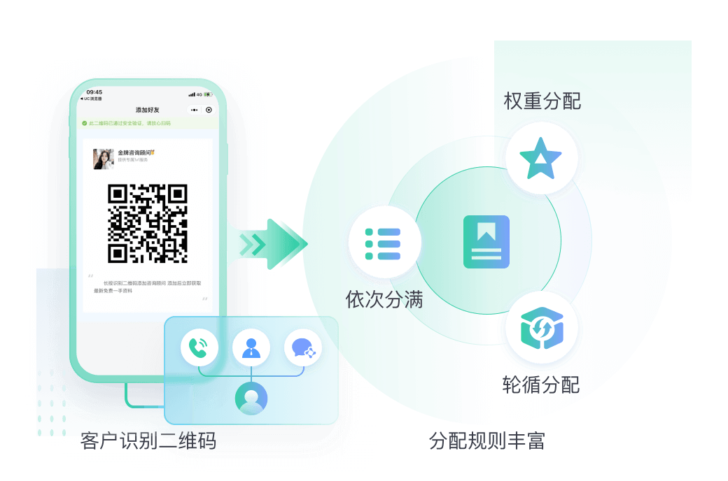 自研活码,支持权重、依次、轮循等多种分配规则,同时确保客户电话、企微身份一致,分配给同一销售,避免撞单,合理分配资源,确保跟进转化效率