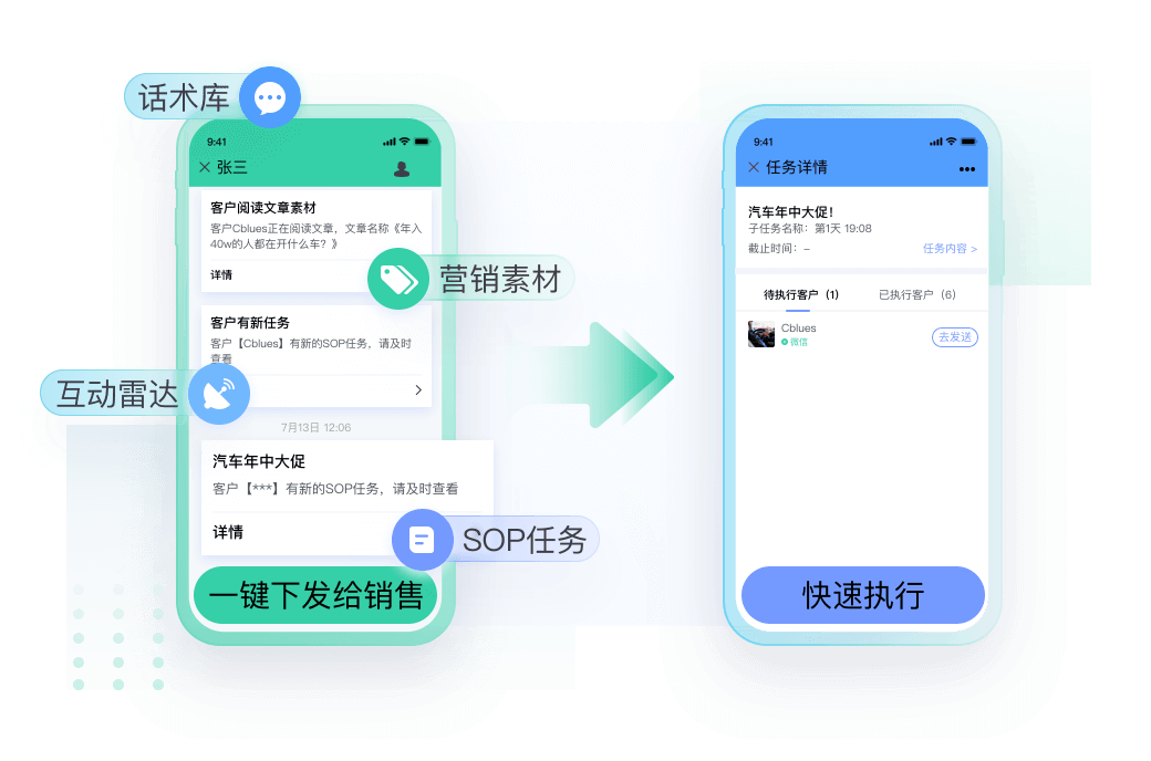 话术库、营销素材、SOP任务快速触达客户,提高沟通效率,标准化销售流程