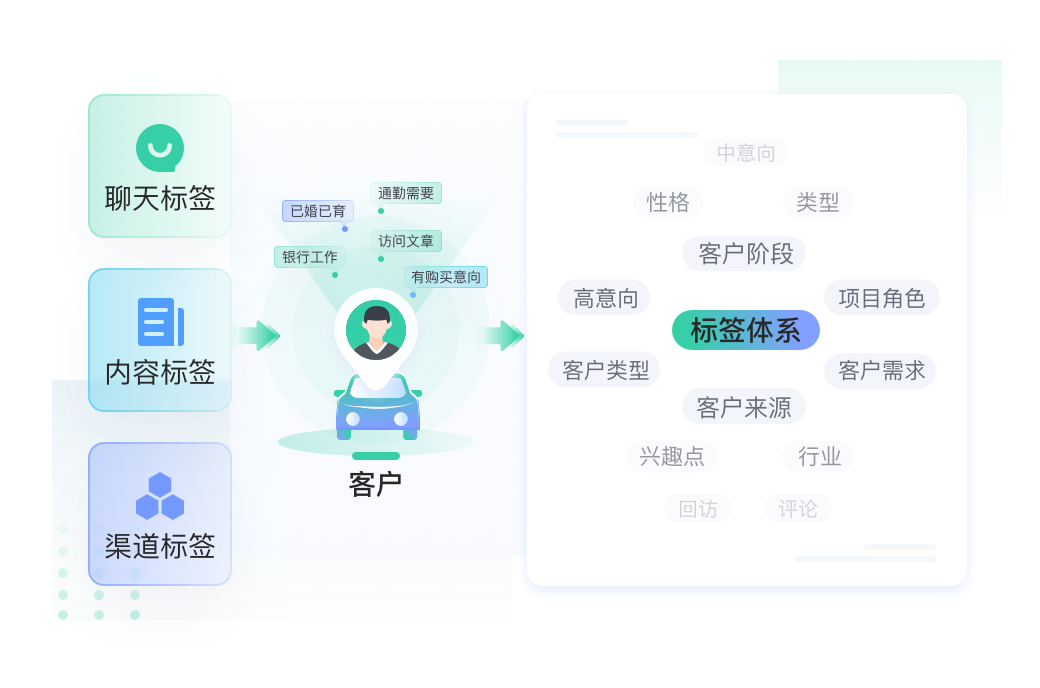 通过自动、手动打标签,构建客户360°标签体系,通过标签筛选锁定高意向客户,重点切入,提高转化效率