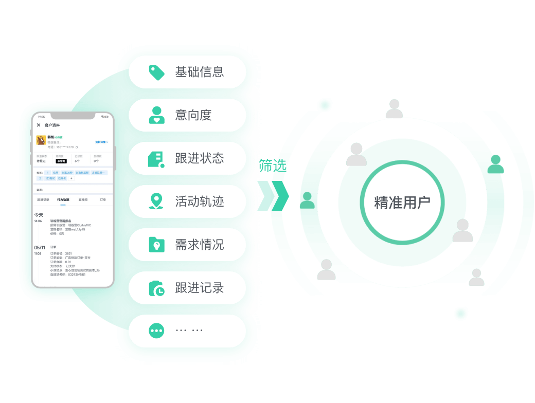 数据打通,客户来源、推广信息、沟通记录、跟进记录、成交情况、等标签信息实时更新,全景记录客户信息,构建360°用户画像