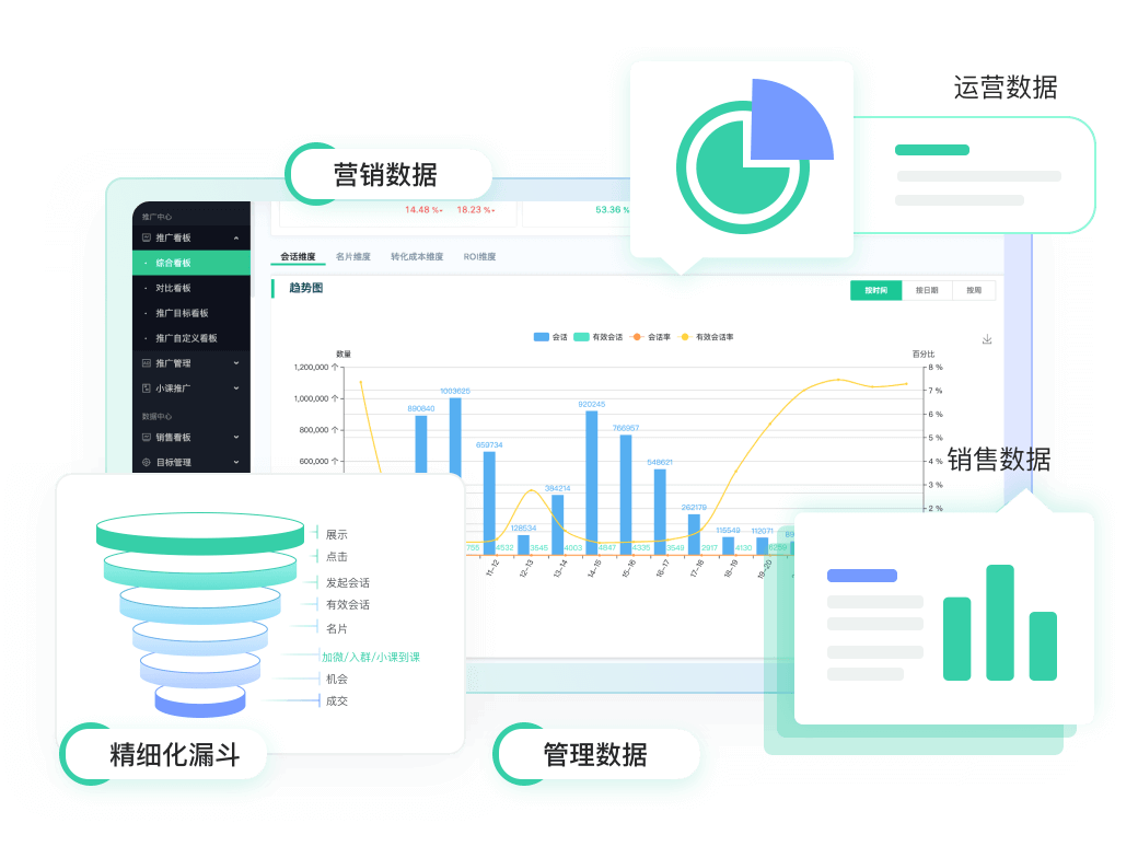 全业务闭环,数据打通,提供多种营销漏斗分析,快速定位运营问题