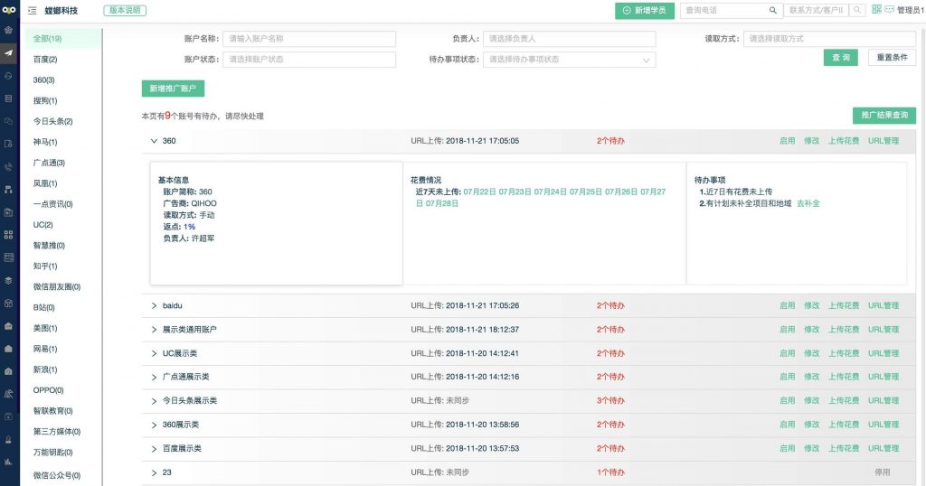 这些过程分别要用到:推广管理工具,在线客服工具、自动分配工具、呼叫中心工具和 CRM(客户关系管理)系统。螳螂科技将这些工具和系统集成到一个平台上。通过打通各个环节中的数据,给销售和管理人员提供精细化决策的参考。