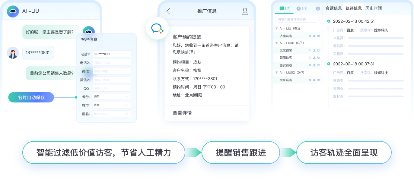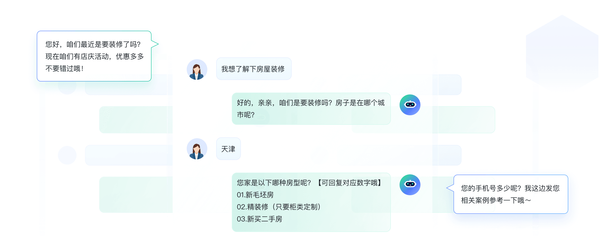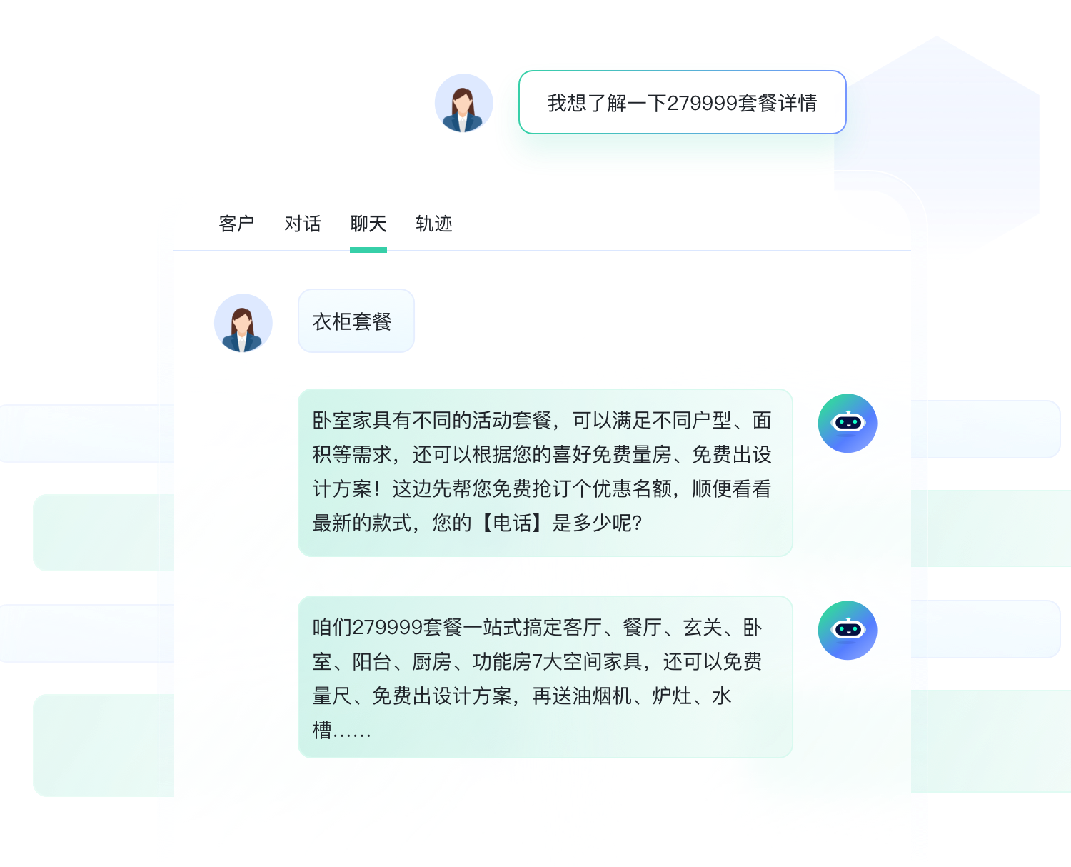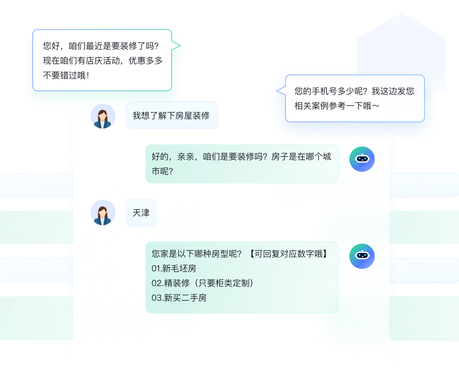 模拟真人聊天沟通,根据访客互动智能推进对话流程,智能引导留资或添加销售