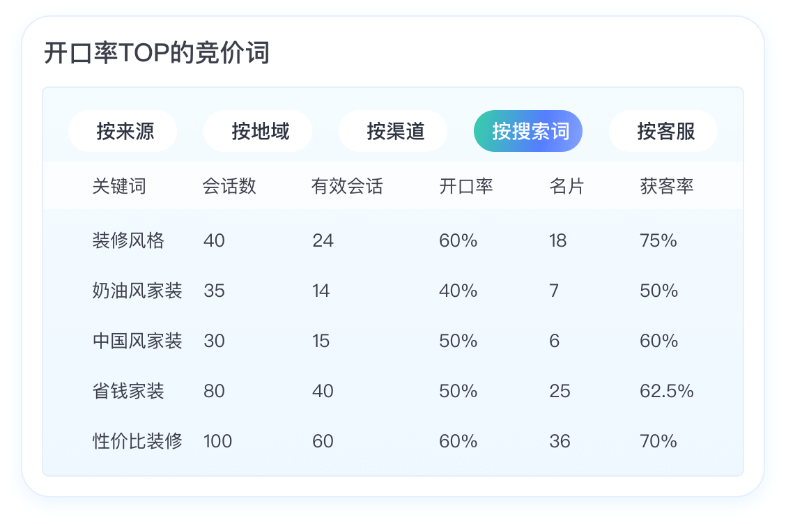 根据访客搜索词、落地页、关键词、来源渠道等主动弹窗不同破冰话术,引导访客开口