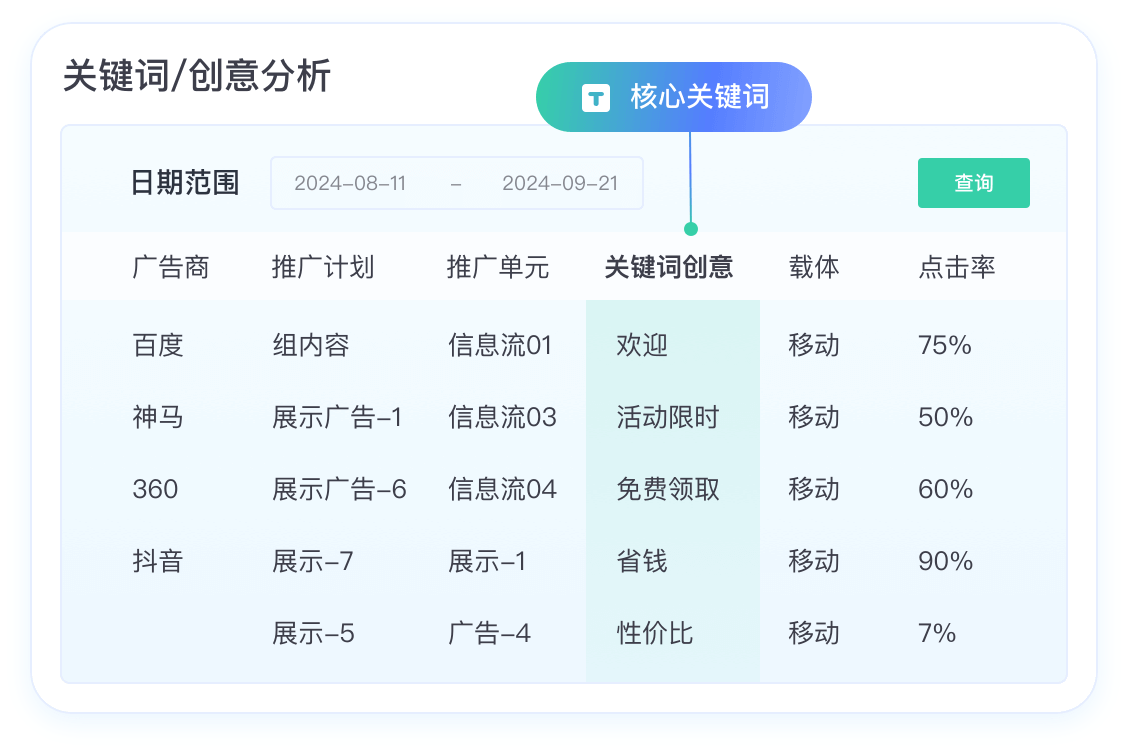 统计核心关键词、计划、创意、页面、分时段流量开口率等,辅助竞价精准调优