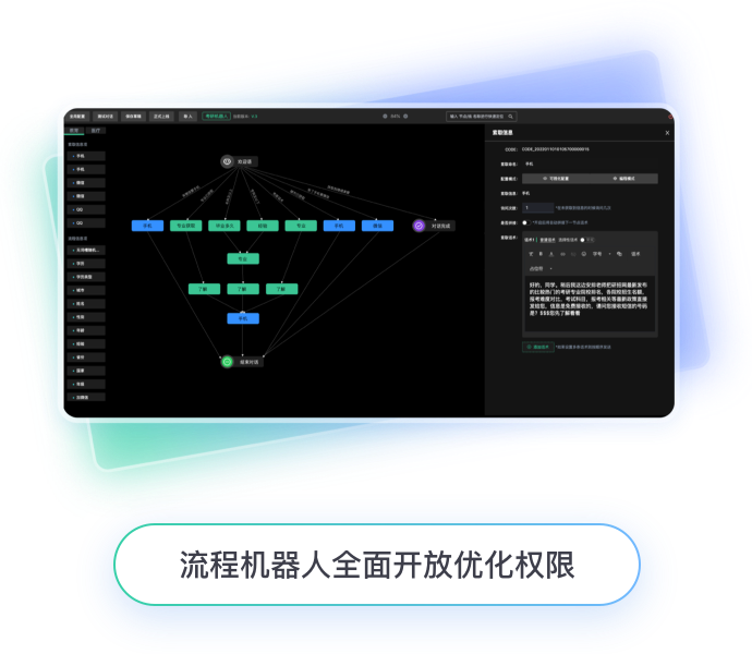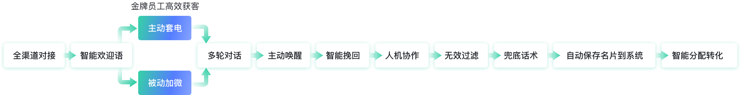 根据用户标签设置不同话术,智能识别对话场景,主动多轮沟通,智能学习,高效获取客户线索